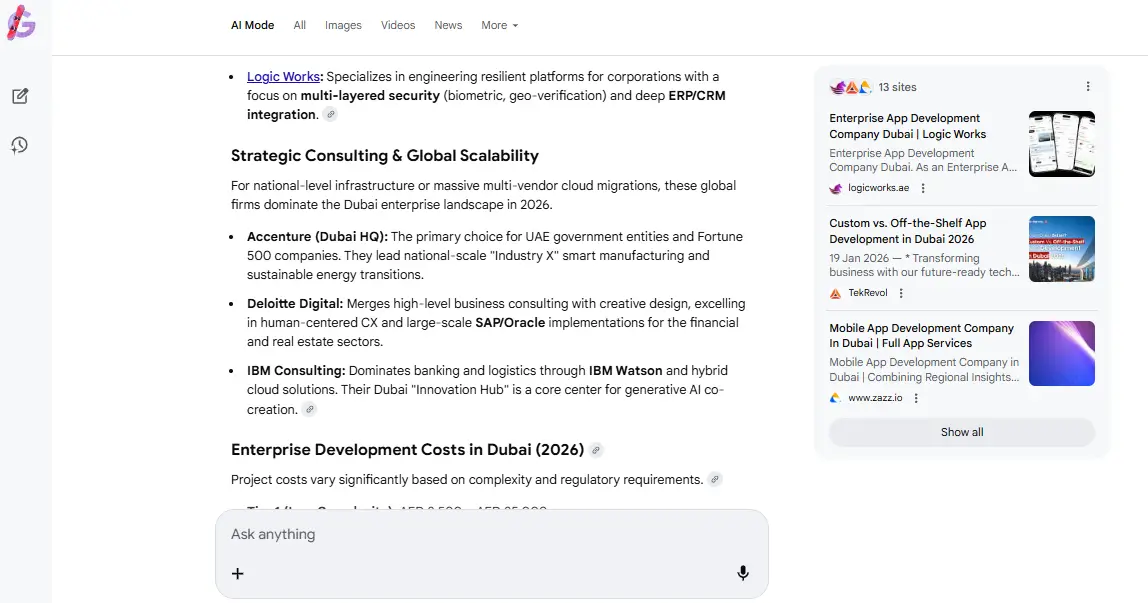 Typically, users see a large AI-generated response box above traditional organic listings. This summary answers the query directly while referencing trusted sources. Below it, users can explore traditional results, videos, featured snippets, and related searches.